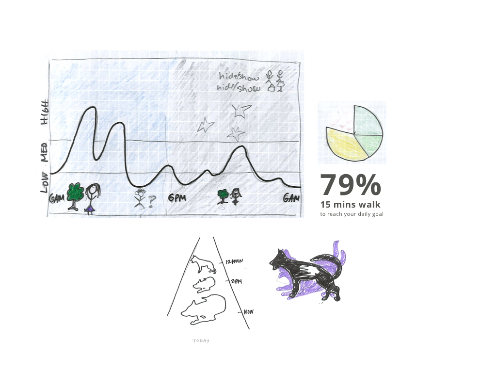I defined basic values for whistle including: Credibility (achieved by accurate synced data, and vet approval), and Supportive (suggesting that insights are there to make the mom feel good, and not to judge her, and lastly Personalized (all activity data is specific to breed, so that the app doesn’t bring you unreasonable expectations).